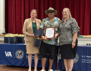 National Vice President Tracy Ferro recently received a plaque and personalized Certificate of Recognition from Gulf Coast Health Care System (Biloxi, Mississippi) Director Stephanie A. Repasky, Psy.D. for his “extraordinary dedication and outstanding commitment.” The August 28 presentation and special citation highlighted specifically Tracy’s achievement of 4,000 hours of volunteer service.