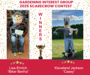 The Fall Gardening Series is nearing completion, having culminated in the much anticipated and heralded scarecrow contest. Participants first learned about the history of scarecrows used in agriculture and viewed the video, “Where do scarecrows come from?” on YouTube. They learned that the process began with children running through fields with noisemakers to scare birds away from crops. It later turned into human-like dolls, which we call scarecrows, and then evolved into machinery doing the job.