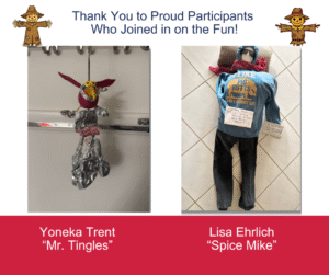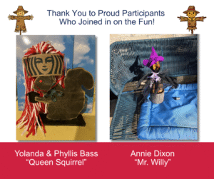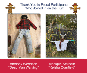 The Fall Gardening Series is nearing completion, having culminated in the much anticipated and heralded scarecrow contest. Participants first learned about the history of scarecrows used in agriculture and viewed the video, “Where do scarecrows come from?” on YouTube. They learned that the process began with children running through fields with noisemakers to scare birds away from crops. It later turned into human-like dolls, which we call scarecrows, and then evolved into machinery doing the job.